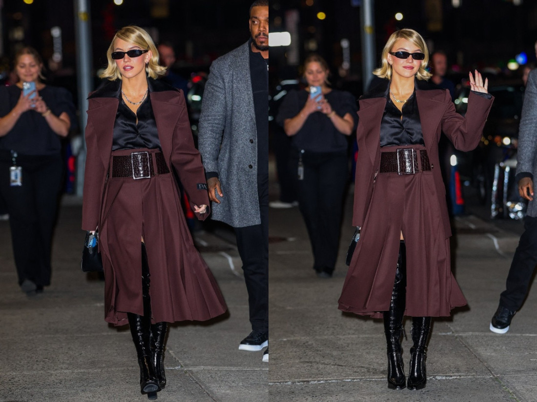 Sidni Svini još jednom je potvrdila svoj status modne ikone nove generacije, pojavivši se na ulicama Njujorka u odvažnom i sofisticiranom izdanju. Njena kombinacija dugog bordo kaputa sa izraženim ramenima, satenske crne košulje koja senzualno pada uz telo i kožnih čizama do butina stvara sliku moćne heroine iz filmskog sveta. Svaki detalj njenog stajlinga odiše stavom – od naočara sa oštrim linijama do voluminoznog pojasa koji naglašava njenu siluetu.
